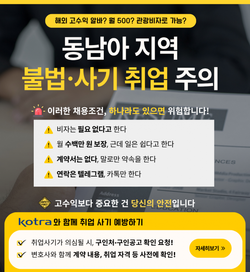최근 동남아 지역 위주로 한국인을 대상으로 하는 취업 사기 사례가 늘어나고 있습니다. 이러한 취업 사기는 좋은 취업 조건을 미끼로 해외 취업을 유도한 뒤, 범죄 관련 불법행위를 강요하거나 금전을 요구 또는 개인정보를 탈취 하는 경우로 이어질 수 있으니, 아래 유의 사항을 참고하시어 각별히 주의하여 주시기 바랍니다.